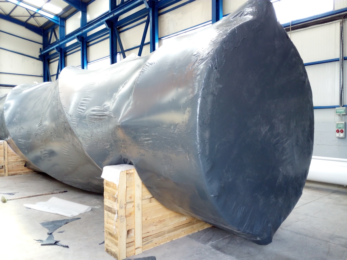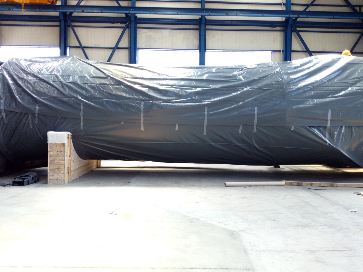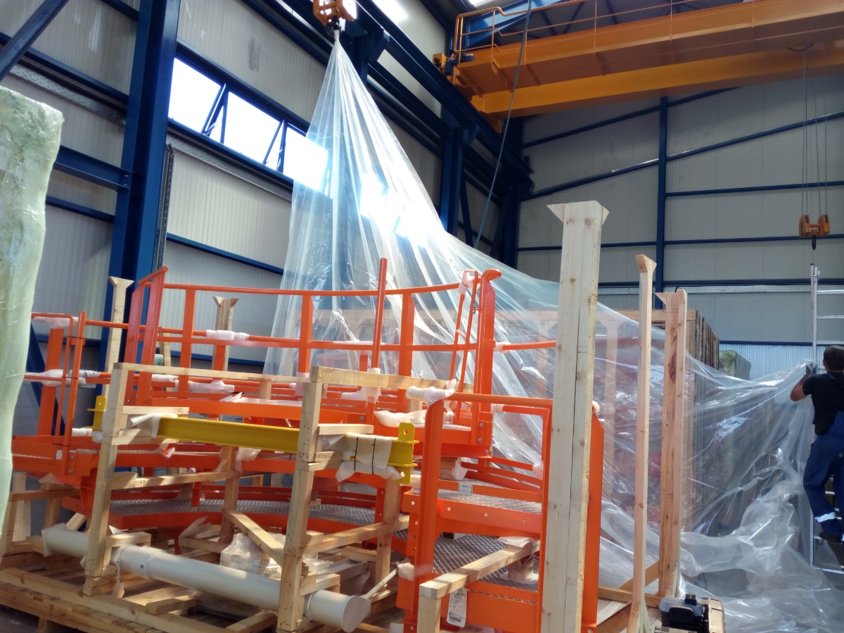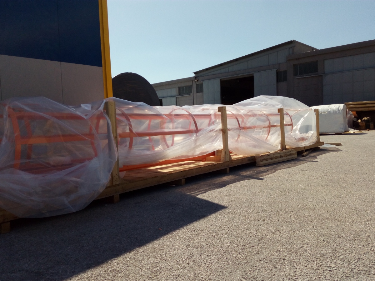 Για την προστασία τους κατά τη θαλάσσια μεταφορά, οι καμινάδες καλύφθηκαν με θερμοσυρρικνούμενο φιλμ πολυαιθυλενίου, παρέχοντας αποτελεσματική προστασία από εξωτερικούς παράγοντες. Επιπλέον, οι περιμετρικές σκαλωσιές των καμινάδων συσκευάστηκαν με τέτοιο τρόπο ώστε να εξασφαλίζεται η προστασία τους, αλλά και η βέλτιστη αξιοποίηση του διαθέσιμου χώρου κατά τη μεταφορά.